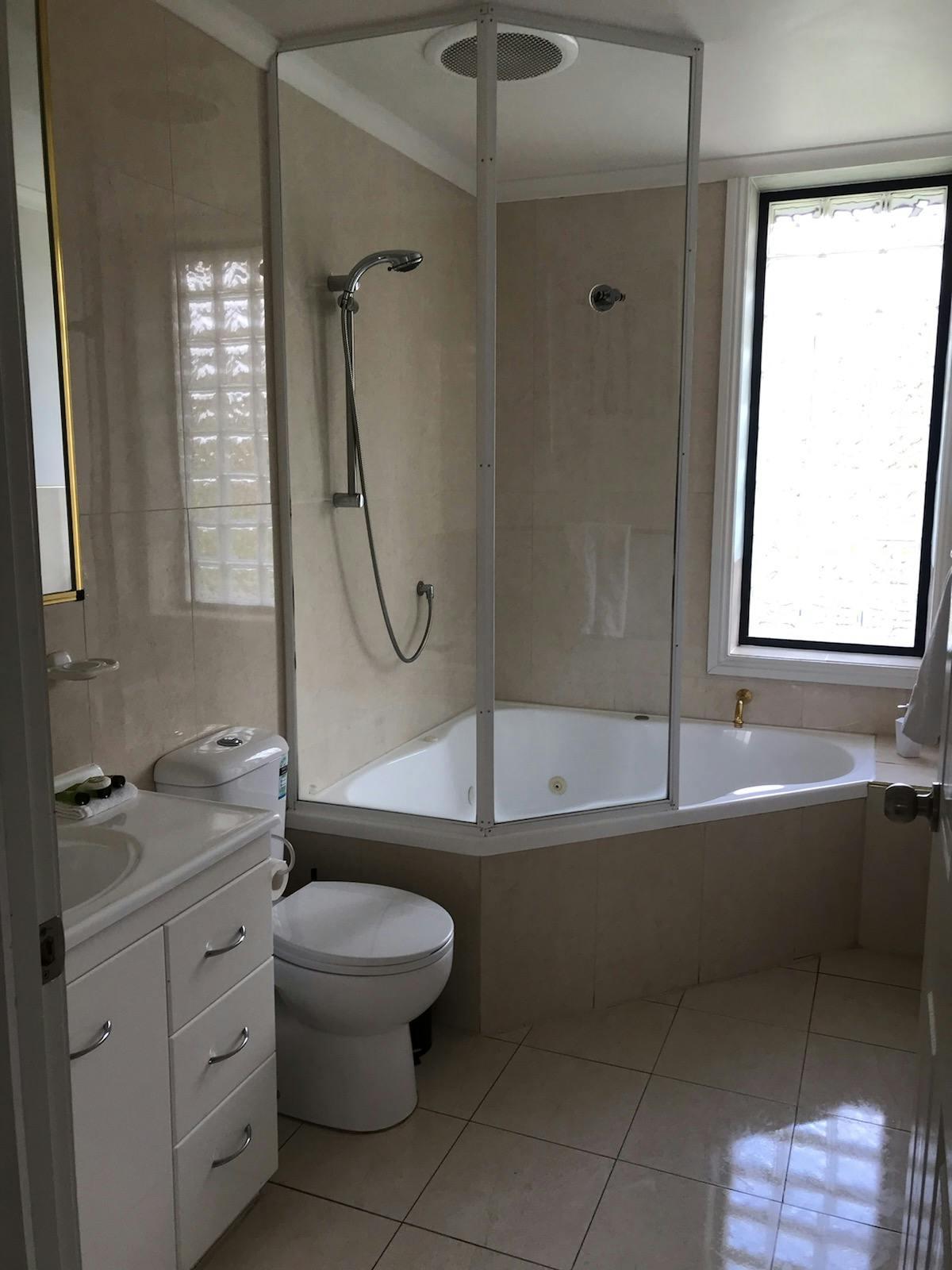 - Bathroom with shower over spa, bathroom amenities and hair dryer.